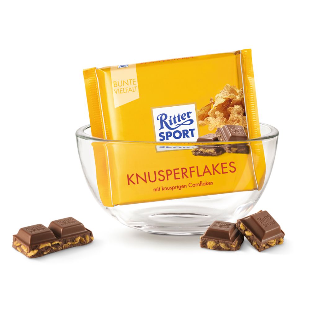 RITTER SPORT Cornflakes gives you breakfast around the clock with crispy cornflakes in creamy chocolate. The flakes are produced and selected according to strict quality standards: after all, breakfast is the most important meal of the day.