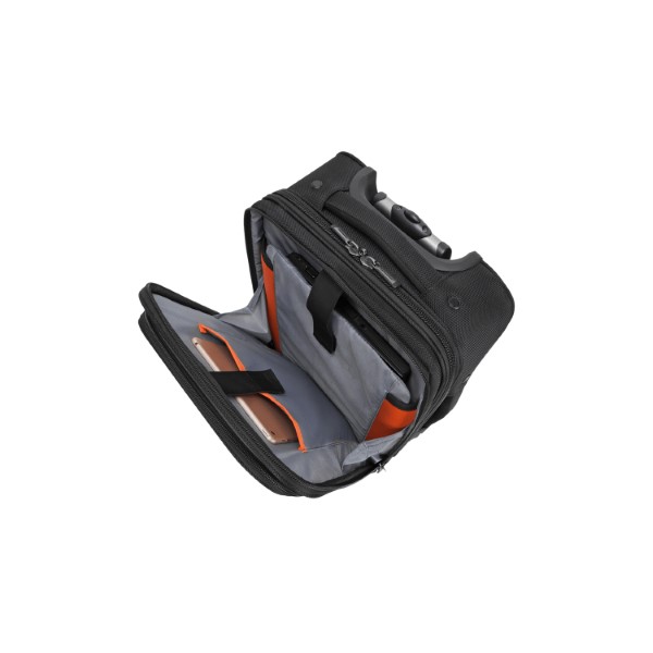 Get smart travel organization with the 12-15.6” CitySmart™ Compact Under-Seat Roller. For on-the-go professionals who value convenience and style, this hardworking roller provides the ideal space, convenience, and features for short haul trips. Safeguard your style with a separate clothing compartment. Protect your laptop in the drop-protective SafePort® Sling. Retractable top and side handles help you hoist overhead or grab from under your seat with ease. Smooth-rolling and quiet wheels combined with a sturdy trolley pole let you maneuver masterfully. Park it with ease thanks to the large stand-up base. Eye-catching orange interior elements highlight the laptop SafePort® Sling, accessories pouches and more, for easy visibility and added style.