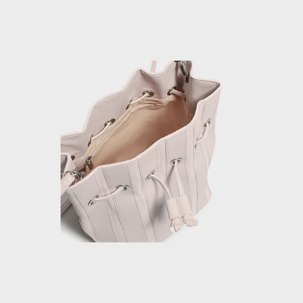 Light Pink bucket bag featuring panelling details and a drawstring closure. Comes with a detachable strap.