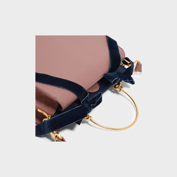 Mauve large handbag featuring velvet bow details and a metallic top handle. Comes with detachable strap.
