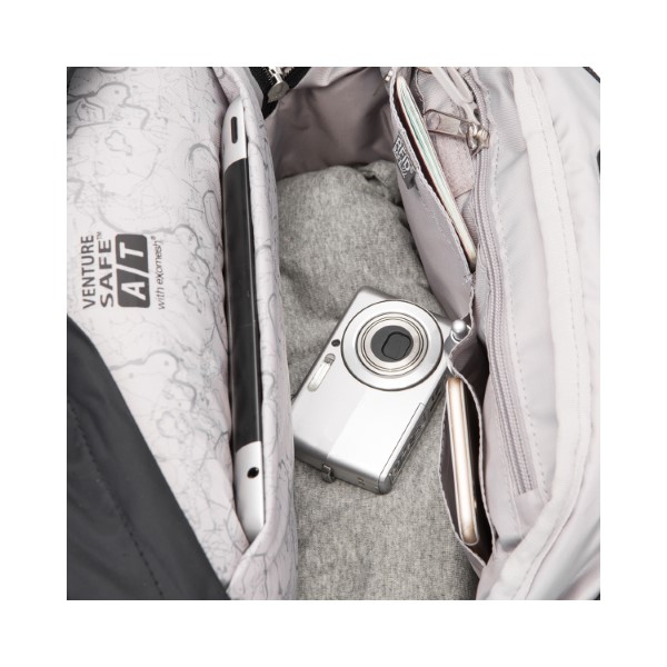 eXomesh slashguard, Carrysafe slashguard strap, RFIDsafe blocking pockets and material, Roobar Sport locking system, Interlocking zip pullers, PopNLock Security Clip, LockNLeave strap