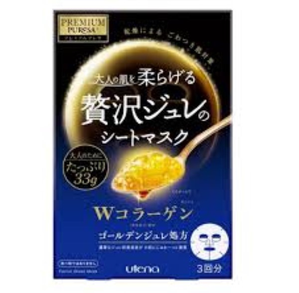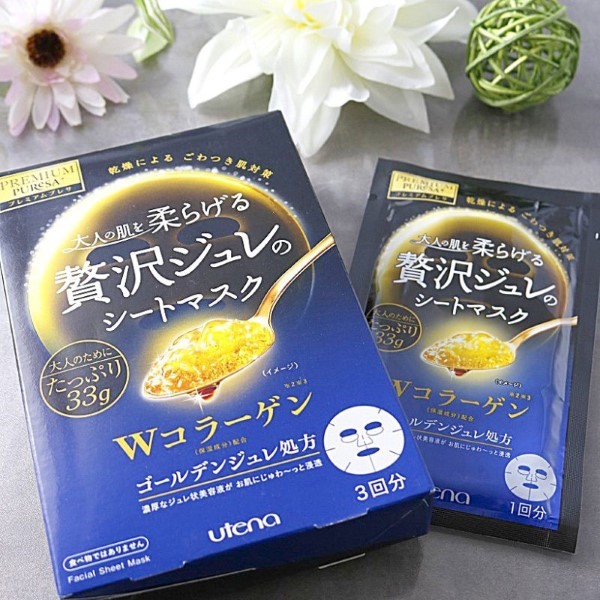 Golden gel mask formula that let the mask brings nourishment deep into skin, making skin soft, smooth and hydrated. It contains moisturizing ingredient ceramide, squalene and eight kinds of amino acids. Dould collagen and trehalose softens and hydrates skin, letting skin showing a glow of moisture and elasticity. The formula does not contains synthetic fragrance, colorings, mineral oil, alcohol, animal-originated ingredients and UV absorbing agents.